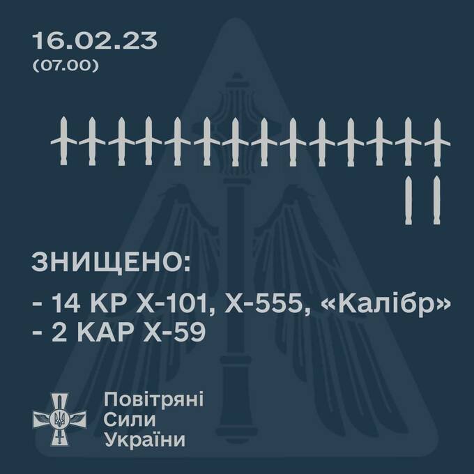 Силами та засобами Повітряних Сил ЗС України знищено 14 крилатих ракет Х-101/Х-555, «Калібр» та дві керовані авіаційні ракети Х-59.