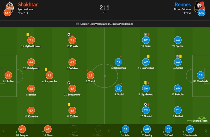У «Ренна» найкращим гравцем матчу визнано Жеремі Доку, який отримав 8,2 бали. Він – найкращий не лише у французькій команді, а й взагалі у матчі.