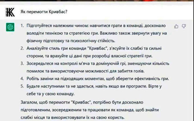 Футболісти «Колоса» з Ковалівки запитали популярного чат-бота ChatGPT, як обіграти криворізький «Кривбас», і отримали вичерпну відповідь.