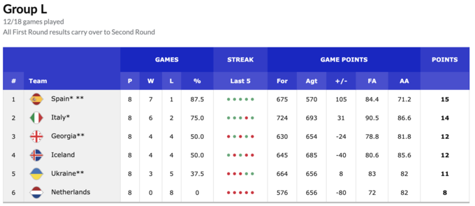 - Поразка Ісландії в матчі з Іспанією + (у разі перемоги Грузії над Нідерландами) перемога Ісландії над Грузією на виїзді (але з незначною різницею в рахунку, не більш ніж у 18 очок)