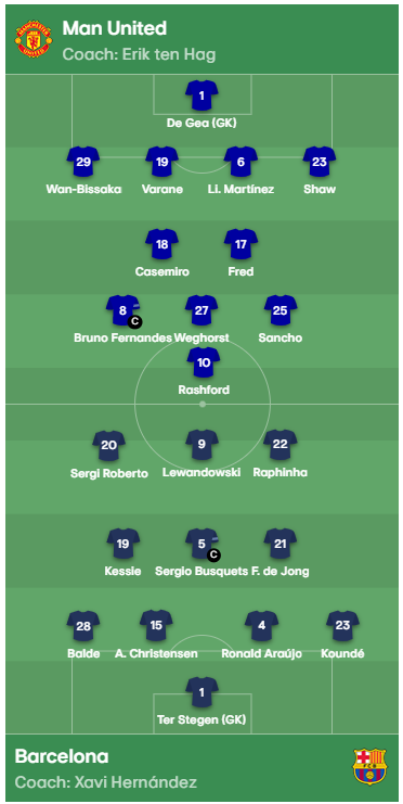 Барселона: тер Штеген, Кунде, Араухо, Крістенсен, Бальде, Кессьє, Бускетс, де Йонг, Рафінья, Левандовськи, Серхі Роберто.