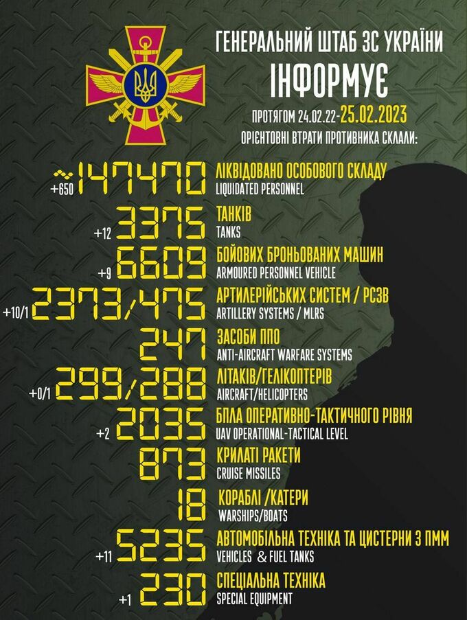 Пропонуємо до вашої уваги зведення загальних бойових втрат росії з 24.02.2022 по 25.02.2023.