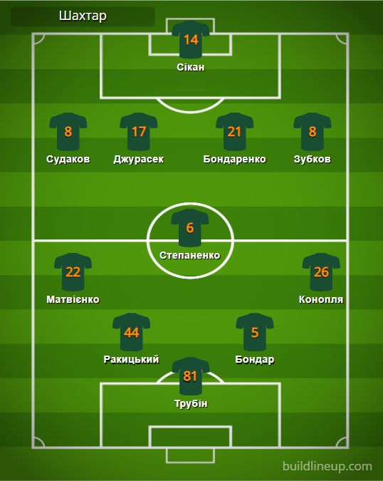 «Шахтар»: Трубін – Матвієнко, Ракицький (Топалов, 62), Бондар, Конопля – Степаненко (Назарина, 67) – Судаков (Петряк, 79), Джурасек, Бондаренко, Зубков (Гочолеішвілі, 61) – Сікан (Келсі, 62).