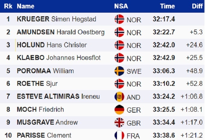 Компанію на подіумі Крюгеру склали два партнери по команді – Харальд Остберг Амундсен та чемпіон світу в цій дисципліні 2-річної давнини, Ханс Крістер Холунд.