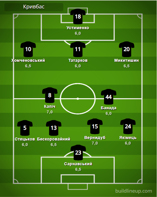 «Кривбас»: Сарнавський – Стецьков, Бескоровайний, Вернидуб, Якімець (Понєдельнік, 89) – Капіч, Банада – Хомченовський, Татарков (Приходько, 90+3), Микитишин (Задерака, 80) – Устименко (Дебелко, 81).
