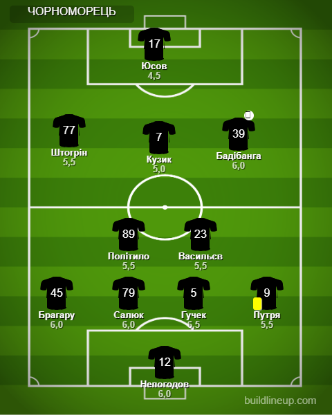 «Чорноморець»: Непогодов – Путря, Брагару, Салюк, Васильєв, Гучек, Кузик (Демченко, 81), Політило (Авагімян, 81), Бадібанга, Юсов (Гладкий, 89), Штогрін (Алефіренко, 73).