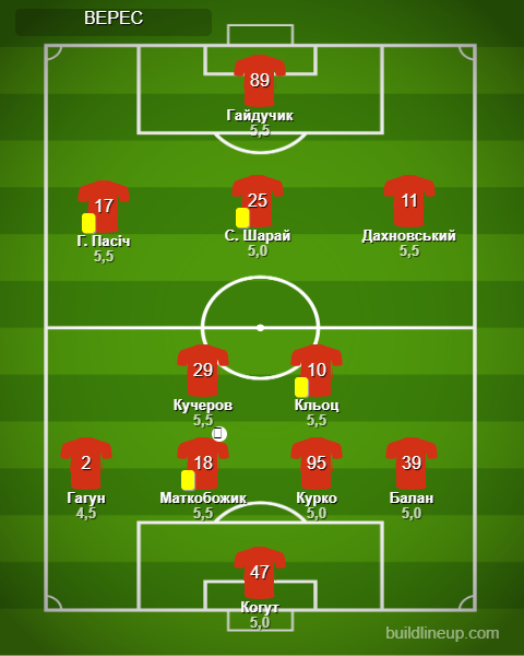 «Верес»: Когут – Гагун, Маткобожик, Курко, Балан – Кльоц, Кучеров - Г.Пасіч, Ст.Шарай (Лебеденко, 73), Дахновський (А. Блізніченко, 73) – Гайдучик (М. Шестаков, 73).
