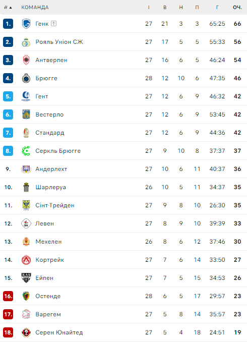 Команда українського форварда посідає 4-те місце у чемпіонаті Бельгії (46 очок), суттєво відстаючи від топ-трійки: Генк (66), Сен-Жилуаз (56), Антверпен (54).