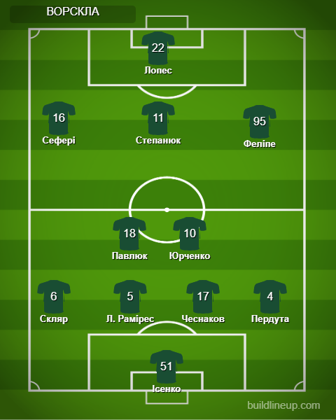 «Ворскла»: Ісенко - Пердута, Рамірес, Чеснаков, Скляр - Юрченко (Яворський, 74), Павлюк - Сефері, Степанюк, Феліпе - Лопес (Хрипчук, 63).