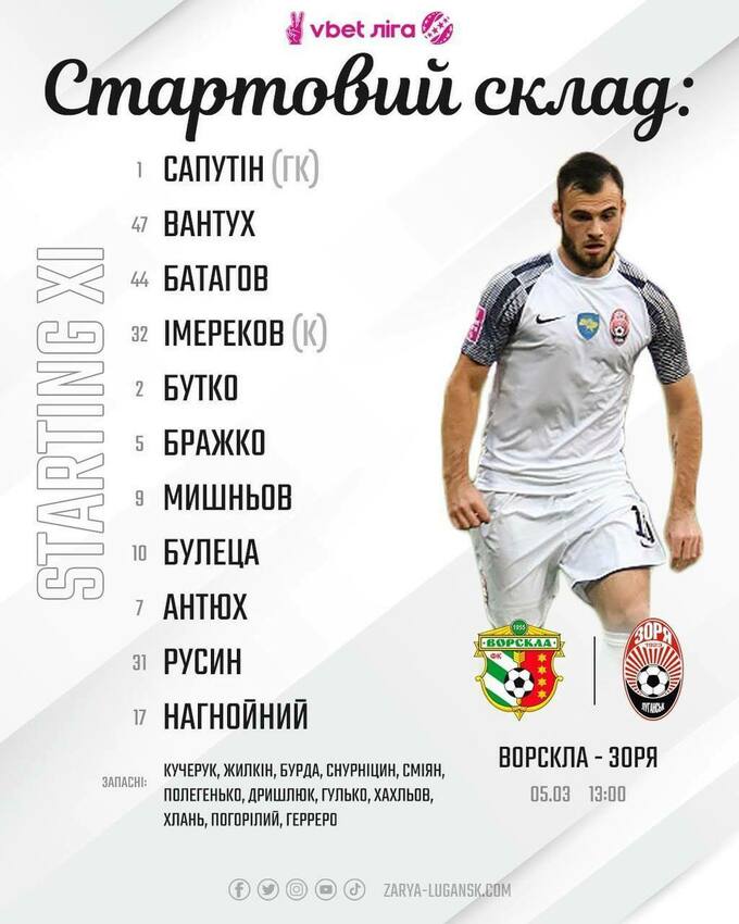 «Зоря»: Сапутін - Бутко, Імереков, Батагов, Вантух - Бражко, Мішньов (Погорілий, 78) - Антюх (Хлань, 63), Булеца, Русин - Нагнойний (Герреро, 46),.