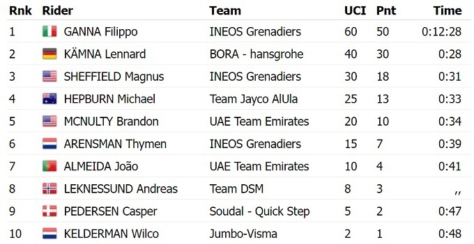 Італійський велогонщик команди «Ineos Grenadiers» Філіппо Ганна виграв перший етап багатоденки Тіррено – Адріатико – гонку із роздільним стартом на 11,5 км у Лідо ді Камайоре. Він випередив німця Леннарда Кемну з «Bora Hansgrohe» і партнера по команді, американця Магнуса Шеффілда.