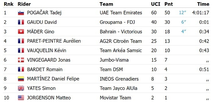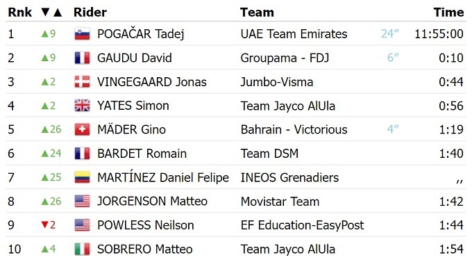 Погачар випередив француза Давіда Году з «Groupama FDJ» і швейцарця Джино Медера з «Bahrain Victorious». Головний суперник Погачара, данець Йонас Вінгегор із «Jumbo Visma», фінішував шостим із відставанням у 43 секунди.