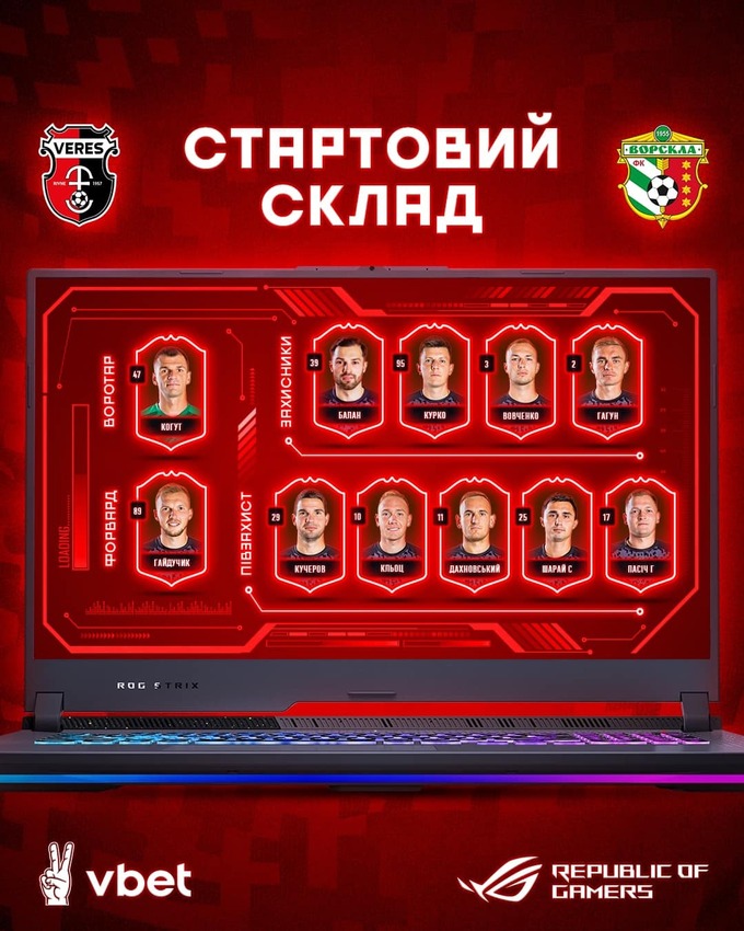 «Верес»: Когут – Гагун, Вовченко, Курко, Балан – Кучеров, С. Шарай (Лебеденко, 74) – Г. Пасіч (В. Шарай, 82), Кльоц, Дахновський (Блізніченко, 80) – Гайдучик (М. Шестаков, 75).