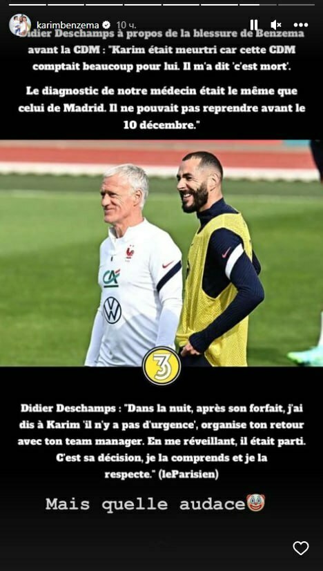 У першій Бензема під словами Дешама написав: «Яке нахабство». Форвард «Реала» супроводжував свій коментар емодзі клоуна. У другому сторіз Бензема також висловився коротко: «Святий Дідьє»: футболіст виклав відео з людиною, яка багато разів повторює слово «брехун».