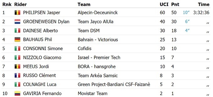 Заключний етап виграв бельгійський спринтер Яспер Філіпсен із «Alpecin Deceuninck». Він випередив Ділана Груневегена та Альберто Дайнезе.