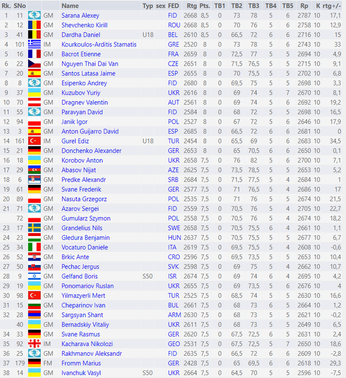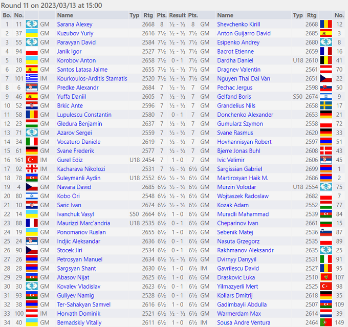 За підсумками 11 турів у топ-3 увійшли Алєксєй Сарана (FIDE), екс-українець Кірілл Шевченко, який виступає за Румунію, та Даніель Дардха з Бельгії. Перша трійка набрала по 8,5 очок, і саме в такому порядку їх розставили додаткові показники. У Кірілла Шевченка – срібло ЧЄ-2023.