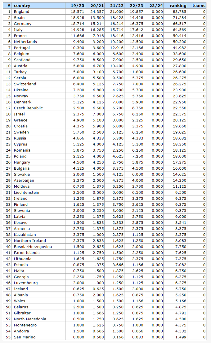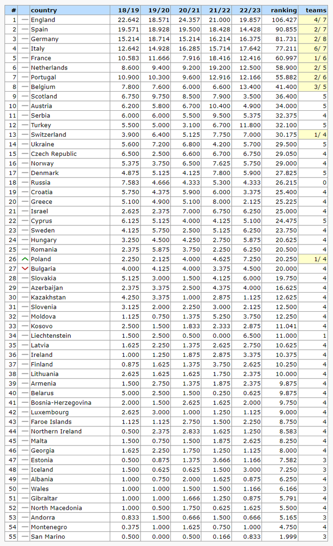 14-та позиція дозволяє Україні зберегти представництво у 5 команд від країни у єврокубках сезону 2024/25. Два клуби братимуть участь у кваліфікації Лізі чемпіонів (плюс один у ЛЄ та два у ЛК). Проте чемпіон України наступного сезону 2023/24 не потрапить напряму до групового раунду ЛЧ 2024/25, і йому доведеться проходити один раунд відбору до ЛЧ (а віце-чемпіону – аж три), у разі поразки у ньому – буде перехід до групи ЛЄ.