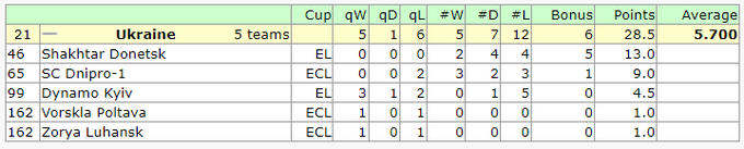 Україна завершила євросезон із показником 5.700, це 21-ше місце у поточній єврокампанії. У 5-річному рейтингу Україна набрала 29.500 та посіла підсумкове 14-те місце. Обігнати Швейцарію з «Базелем» у боротьбі за 13-ту позицію не вдалося [таблиця 1].