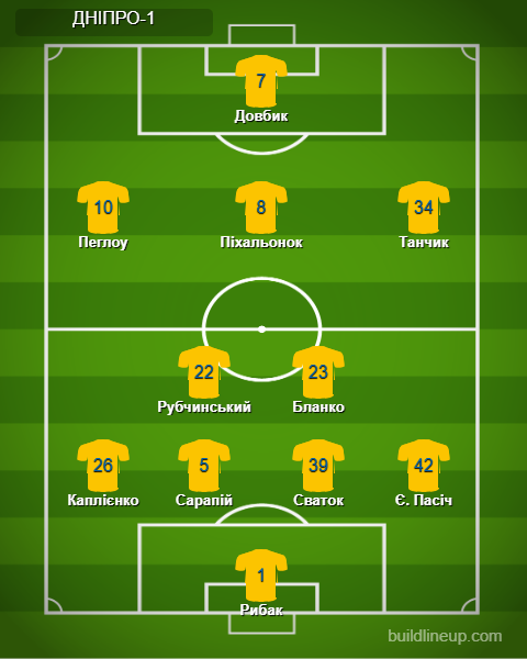 «Дніпро-1»: Рибак - Є. Пасіч (Підлепенець, 59), Сваток, Сарапій, Каплієнко - Рубчинський (Назаренко, 86), Бланко (Танковський, 77) - Танчик (Хайнер, 59), Піхальонок (І. Когут, 86), Пеглоу - Довбик.