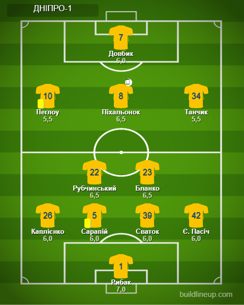 Заміни Дніпра-1: Підлепенець - 5,5, Хайнер - 5,5, Танковський - 5,5, Назаренко - 5,0, І. Когут - 5,0.