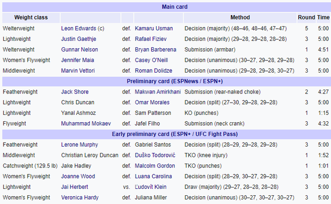 - Леон Едвардс (20-3) »– Камару Усман (20-2) – MD 5, рішенням більшості (48-46, 48-46, 47-47)