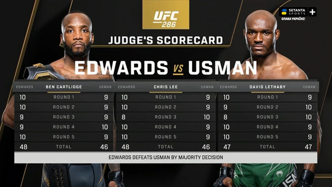 Карточки суддів: Леон Едвардс (Англія) – Камару Усман (Нігерія) – MD 5 (48–46, 48–46, 47–47)