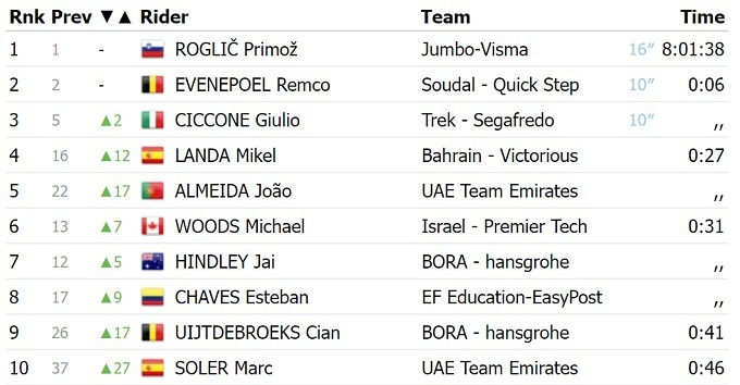 Чікконе у фінішному спринті випередив переможця вчорашнього етапу і лідера загального заліку Пріможа Рогліча, а також бельгійця Ремко Евенпула з «Soudal Quick Step».