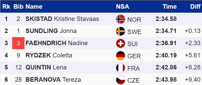 У жінок свою четверту поспіль перемогу в спринтах на Кубку світу здобула норвежка Крістін Шістад. Компанію на подіумі їй склали шведка Йонна Сундлінг і швейцарка Надін Фендріх.