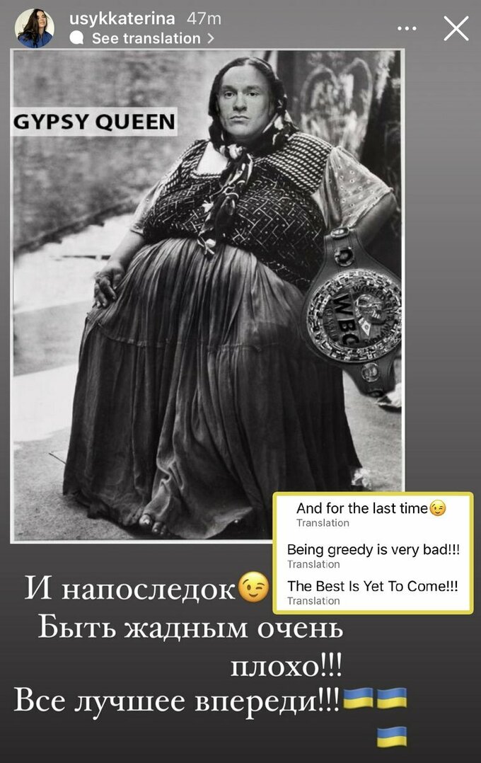 «І насамкінець: бути жадібним дуже погано. Все найкраще попереду», – написала Катерина, підтвердивши, що переговори про бій зірвалися через неймовірні фінансові апетити британця.