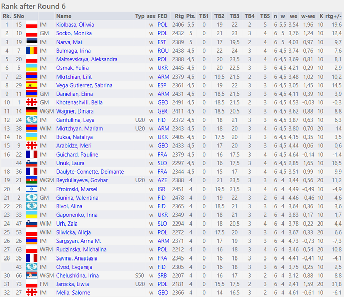 У турнірі лідирує Олівія Кіолбаса (Польща) – 5,5 бала. Далі йдуть Моніка Сочко (Польща) та Май Нарва (Естонія) – по 5 очок.
