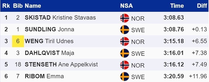 У жінок свою п'яту перемогу поспіль у спринтах на Кубку світу здобула норвежка Крістін Шистад. Третьою стала Тіріль Венг, яка достроково забезпечила собі перемогу в загальному заліку Кубка світу. Шведка Майя Дальквіст завдяки четвертому місцю завоювала малий Кубок світу в спринті.