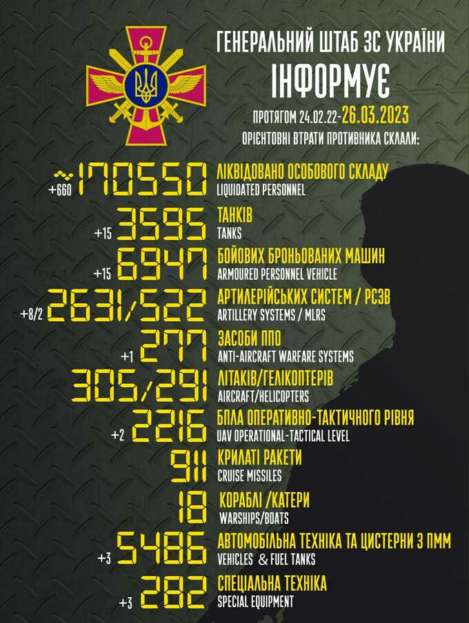 Пропонуємо до вашої уваги зведення загальних бойових втрат росії з 24.02.2022 по 26.03.2023.