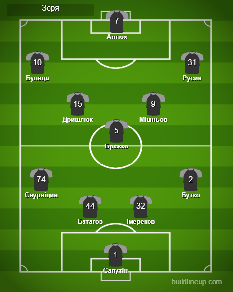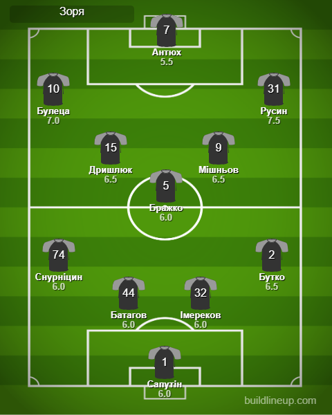 «Зоря»: Сапутін – Сапутін – Бутко, Імереков, Батагов, Снурніцин, Бражко, Дришлюк (Хахльов, 88), Булеца (Полегенько, 88), Мішньов (Вантух, 60), Н.Русин (Шахов, 73), Антюх (Погорілий, 73).