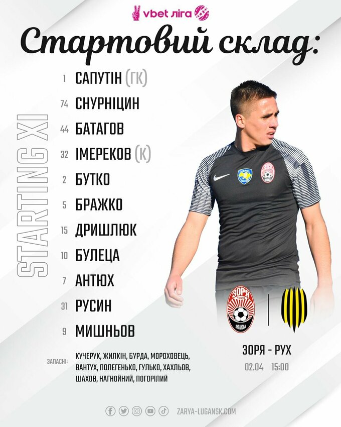 «Рух» після зимової паузи один матч виграв і двічі програв. Півтора тижня тому відбулася заміна головного тренера: замість Леоніда Кучука команду очолив Віталій Пономарьов. Матч проти «Зорі» буде дебютним для спеціаліста, який раніше ніколи не працював головним тренером. Завдання Пономарьова – залишити «Рух» у Прем’єр-лізі. Зараз команда посідає лише 14 місце.