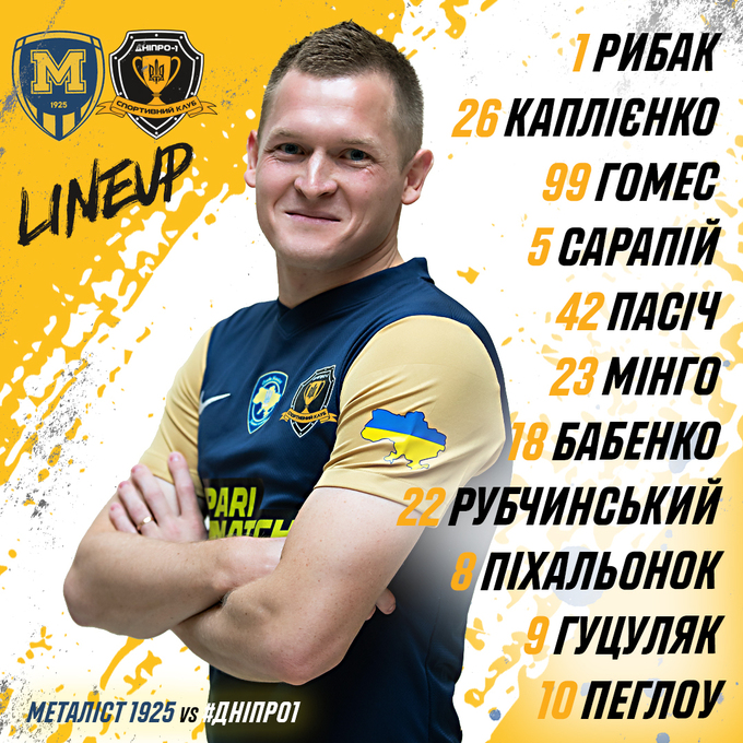 «Дніпро-1»: Рибак – Каплієнко (Матарріта, 68), Сарапій, Гомес, Є. Пасіч (Хайнер, 68) – Рубчинський (Когут, 61), Бабенко – Бланко (Назаренко, 61), Піхальонок, Гуцуляк – Пеглоу (Довбик, 27).