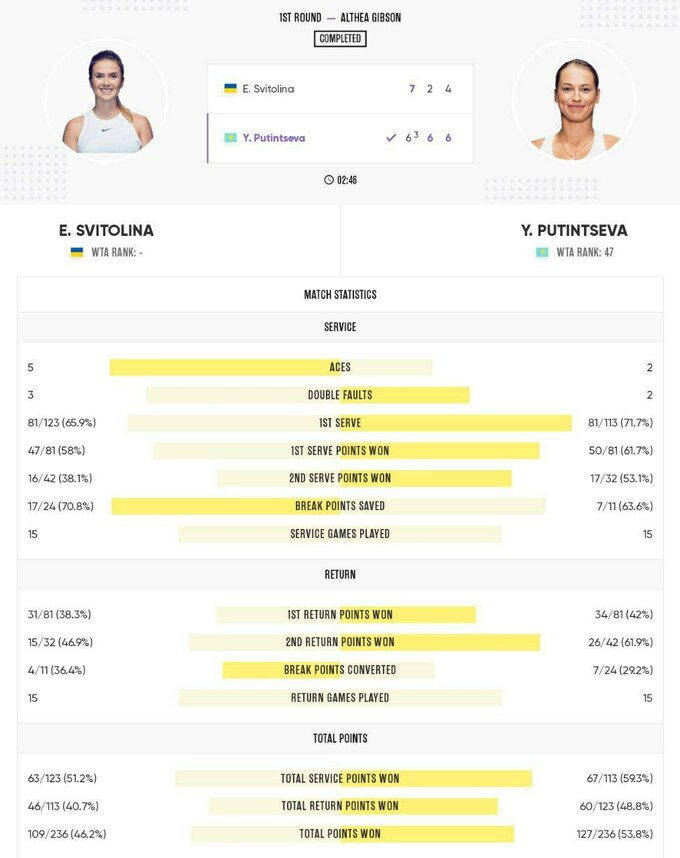 Вдало стартувати на тай-брейку не вдалося – Путінцева повела 3:1. Але тут Еліна показала, що не просто так була третьою ракеткою світу й обігрувати таких, як Путінцеву, їй не те що під силу, а взагалі – раз плюнути. Українка з рахунку 1:3 виграла 6 поінтів поспіль у домінуючому стилі та взяла перший сет.