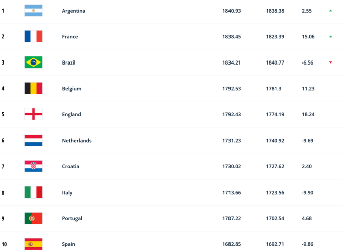 У рейтингу ФІФА лідирують чинний чемпіон світу Аргентина та фіналіст ЧС-2022 Франція, а топ-5 замикають Бразилія, Бельгія та Англія.