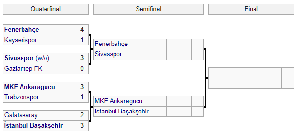 У півфінальних протистояннях, які складатимуться з двох матчів, зіграють: Сівасспор – Фенербахче, Башакшехір – Анкарагюджю.