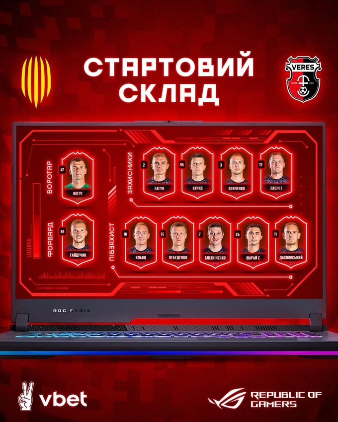 «Верес»: Когут – Лебеденко, Вовченко, Курко, Гагун – Кльоц – Г. Пасіч, С. Шарай, Дахновський, Блізніченко – Гайдучик (М. Шестаков, 83).
