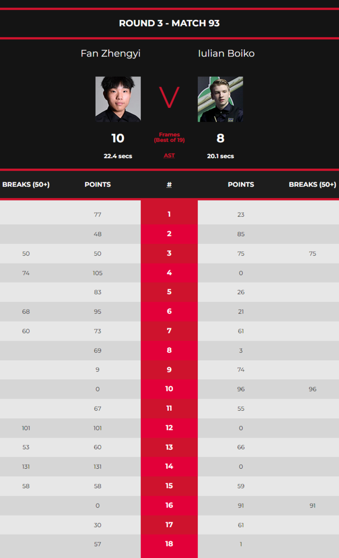 Гра йшла до 10 перемог у фреймах. Українець програв першу сесію (3:6), а потім поступався з рахунком 5:9. І з цієї миті Бойко розпочав камбек. Йому вдалося у складній боротьбі взяти три партії поспіль і зробити рахунок 8:9. Залишалося взяти ще дві. Однак у 18-му фреймі Юліан програв, і матч завершився його поразкою (8:10).