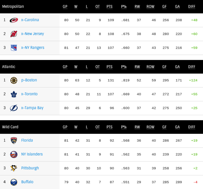 У підсумку Флорида займає перше wild-card місце з 92 пунктами, у Айлендерс на 1 очко менше. Обом командам залишилося провести по одному матчу. Позаду них знаходиться Піттсбург з 90 очками, але двома матчами до кінця регулярки. При цьому шанси заскочити у плей-оф зберігає Баффало, який має три матчі в запасі.