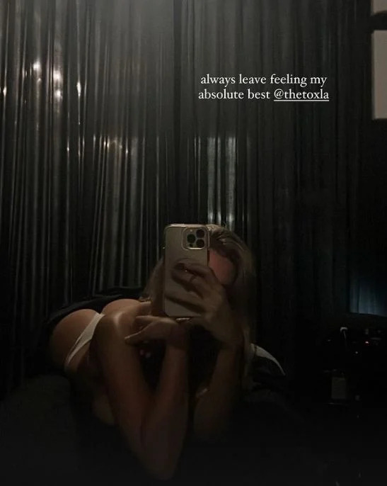 На знімку, опублікованому в сторіс Instagram, 27-річна дівчина робить селфі топлес, прикриваючи оголені груди руками.