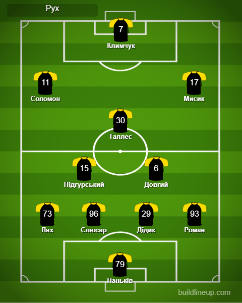 «Рух»: Паньків, Роман, Слюсар, Дідик (Холод, 11), Лях, Підгурський, Мисик (Альваренга, 70), Довгий (Притула, 70), Таллес (Карабін, 88), Соломон, Климчук.