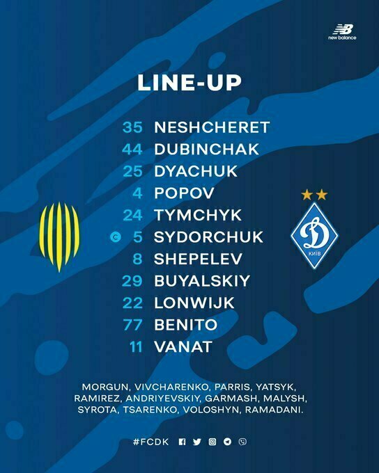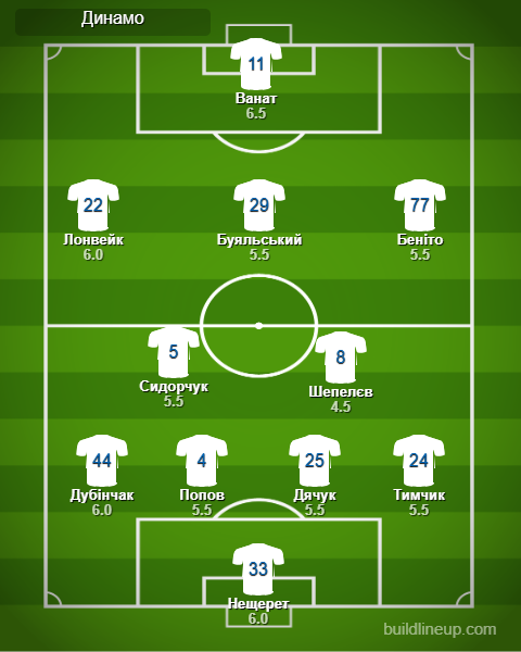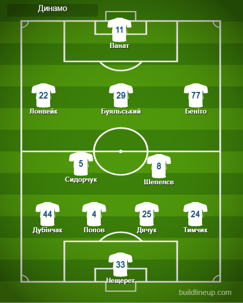 «Динамо»: Нещерет, Попов, Сидорчук, Шепелєв (Гармаш, 46), Ванат (Рамірес, 64), Лонвейк (Андрієвський, 64), Тимчик, Дячук, Буяльський, Дубінчак, Беніто (Царенко, 46).