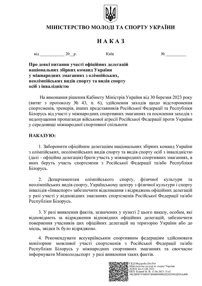 На офіційному сайті Міністерства молоді та спорту опублікований наказ щодо бойкоту російських спортсменів.