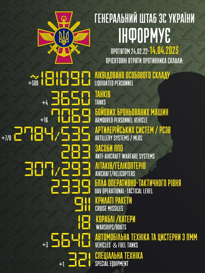 Пропонуємо до вашої уваги зведення загальних бойових втрат росії з 24.02.2022 по 14.04.2023.