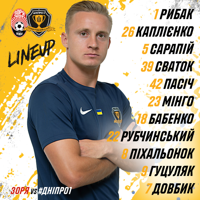 «Дніпро-1»: Рибак – Каплієнко (Матарріта, 44), Сваток, Сарапій, Є. Пасіч (Хайнер, 18) – Бабенко – Бланко, Рубчинський (Пеглоу, 61), Піхальонок, Гуцуляк – Довбик.