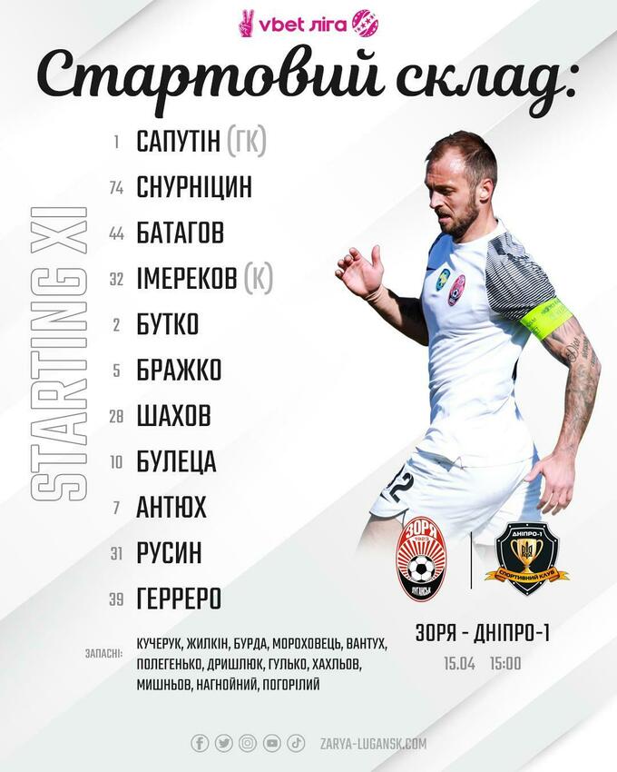 «Зоря»: Сапутін – Снурніцин, Батагов, Імереков, Бутко – Шахов (Дришлюк, 78), Бражко – Антюх (Хахльов, 66), Булеца (Вантух, 84), Русин (Мишньов. 84) – Герреро (Полегенько, 78).