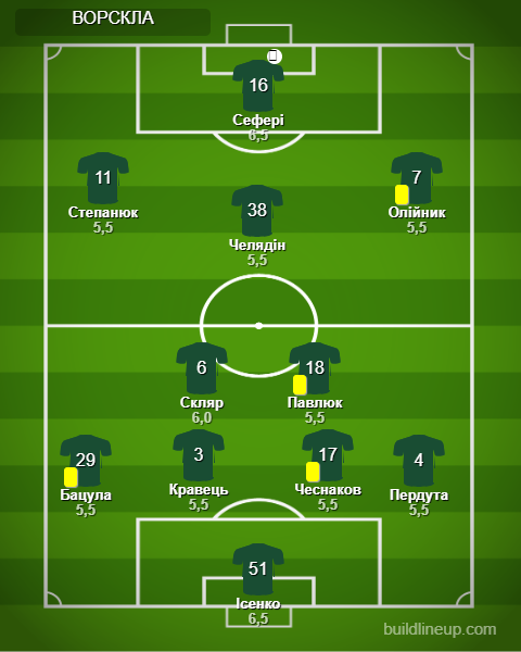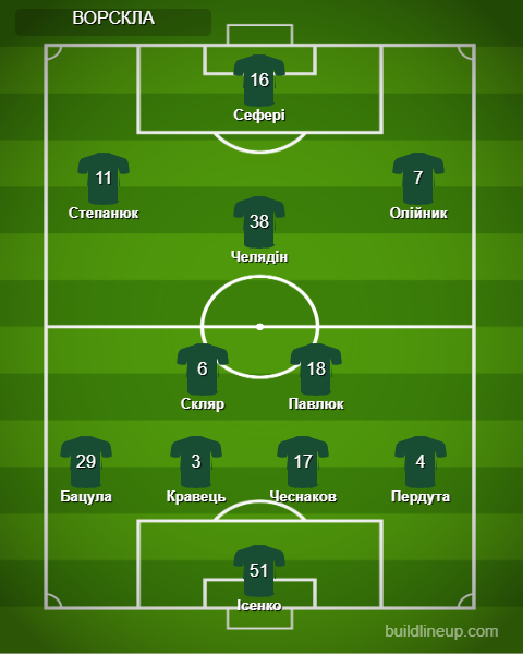 «Ворскла»: Ісенко - Пердута, Чеснаков, Кравець, Бацула - Павлюк, Скляр - Олійник (Яворський, 88), Челядін (Феліпе, 68), Степанюк - Сефері.