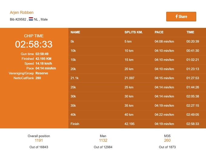 У своїй віковій категорії 39-річний Роббен посів 260 місце серед 1873 учасників.